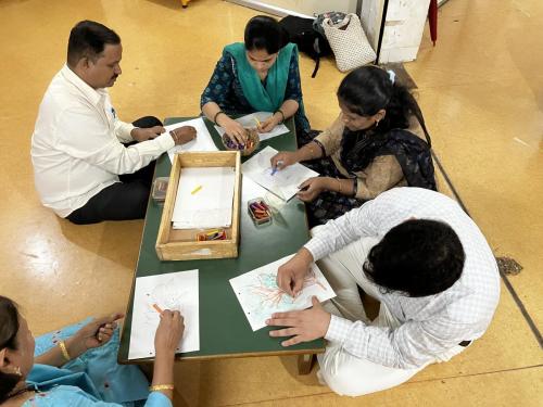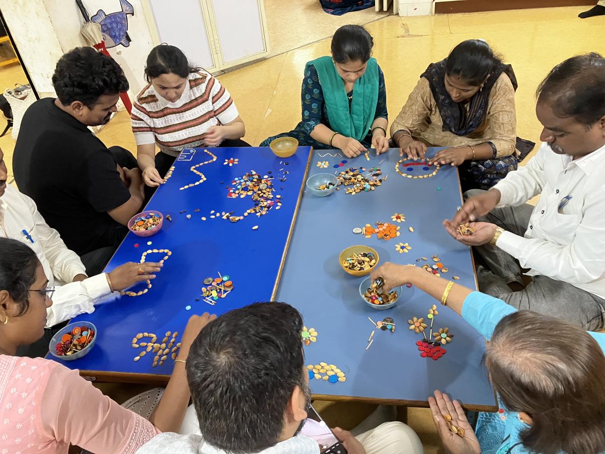 त्यानंतर पालकांना गटांमध्ये विभागून मुलं शाळेत करतात त्या विविध सर्जनशील कृती करून पाहण्याची संधी देण्यात आली. मुक्तचित्र काढणे, मातीकामातून वस्तू तयार करणे, तसेच विविध साधनांच्या सहाय्याने रचना करणे अशा कृतींमध्ये पालकांनी उत्साहाने सहभाग घेतला. या सर्जनशील कृतींमध्ये तयार झालेल्या पालकांच्या कलाकृतींमधून त्यांच्या मनात दडलेल्या भावना, विचार आणि अनुभव सुंदरपणे व्यक्त झाले. यावरून सर्जनशीलतेचा वापर केल्याने भावना व्यक्त होतात आणि मन हलके होते, हे अधोरेखित झाले. अशाच प्रकारे मुलांच्या भावनांचाही निचरा होण्यासाठी अशा कृती मोठी मदत करतात, हे पालकांना प्रत्यक्ष जाणवले.