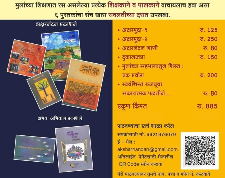 मुलांच्या शिक्षणात रस असलेल्या प्रत्येक शिक्षकाने व पालकाने वाचायलाच हवा असा सहा पुस्तकांचा संच खास सवलतीच्या दरात उपलब्ध.